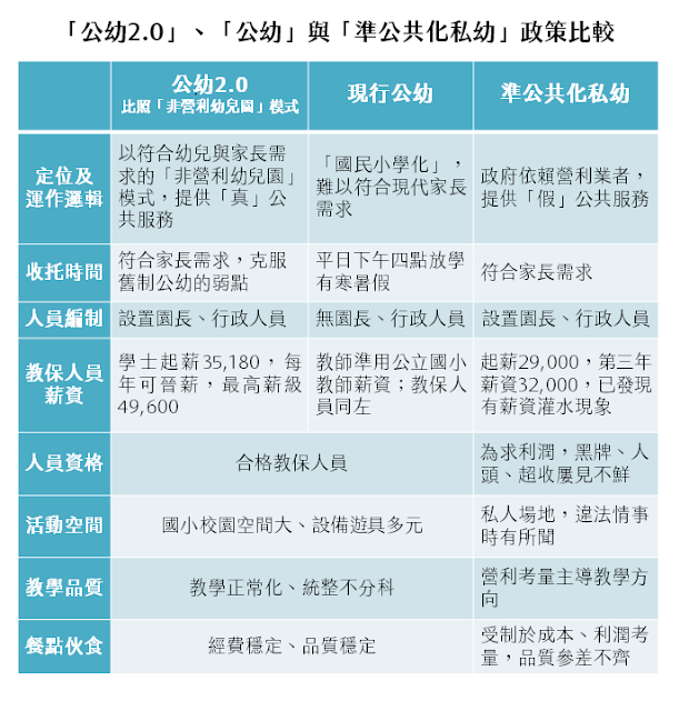 這是人盡皆知的道理,難道政府不懂嗎?只要政府、公立國小善用因少子女化而多出的校園空餘空間,擴增公幼2.0,這套政策將一舉改善現行公幼和準公共私幼的缺失,詳如下表: