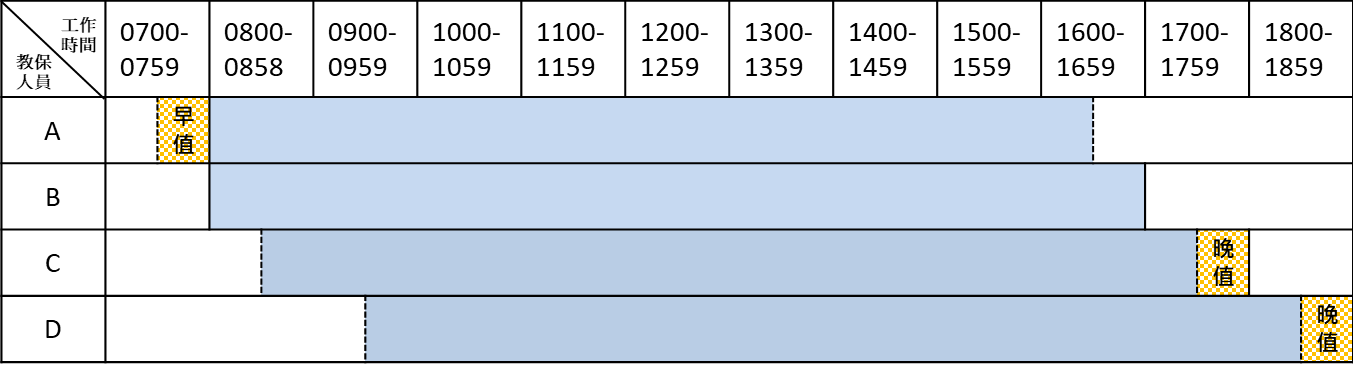 註:A、C、D教保人員工時增加0.5小時,分別輪流早值與晚值。 |