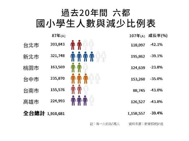 過去二十年間,全台國小在學人數滑落四成(四成!),形同「陸沉」(附錄二)。日前教育部宣布調高準公共化私幼收費,以吸引私幼加入,一位網友回應此新聞:「記得以前小學時一班學生約有45-50人,一個年級約有9個班級,現在聽說每班只有30人左右,每個年級約6個班級,其實這樣一來空出的教室其實是非常的多,而且連國中,高中大學,其實都有收不到學生的問題出現,只要將這些閒置空間用來做為公幼使用,還有需要等這麼久才能實施公幼嗎?」(蘋果日報2019/4/2)