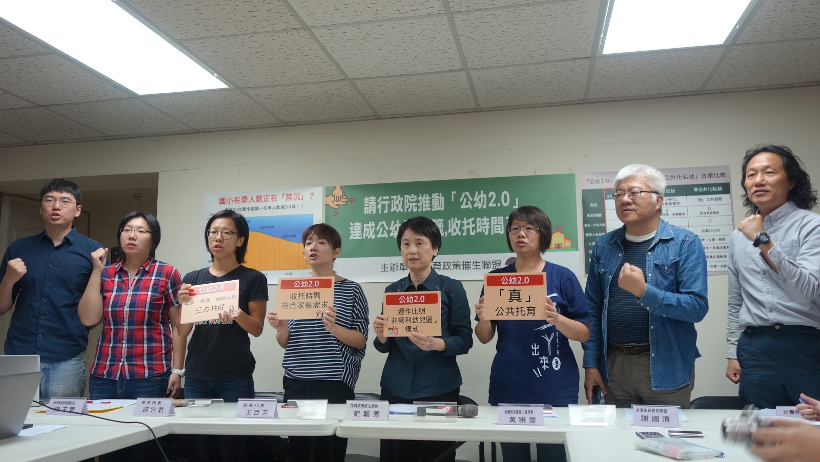 托育政策催生聯盟呼籲:面對著長久以來揮之不去的超低生育率,台灣正在跟時間賽跑,現任總統及下一屆總統,以及行政院、教育部,實有必要胸懷大志,拿出智慧,縮小準公共私幼政策規模,改以良善的非營利幼兒園模式廣設「公幼2.0」,務求於2024年達到真公共幼兒園(舊制公幼+非營利幼兒園+公幼2.0)佔七成的目標,做到「公共幼兒園零抽籤+收托時間正常化」!如此才是有效的政策作為,才能充分回應現代母親兼顧工作與家庭的需求,減緩低生育率,讓社會生生不息!