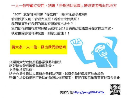 一人一信呼籲立委們,別讓『非營利幼兒園』變成業者嗜血的地方