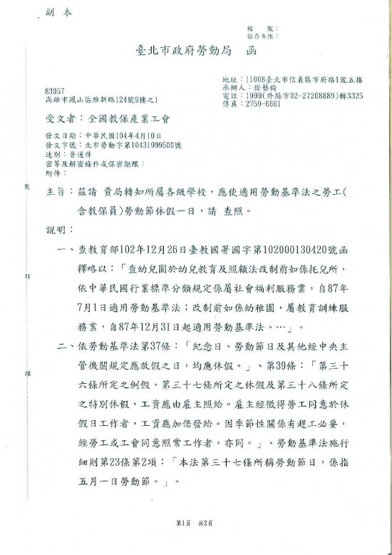 於4月14日收到台北市勞動局函文,告知…