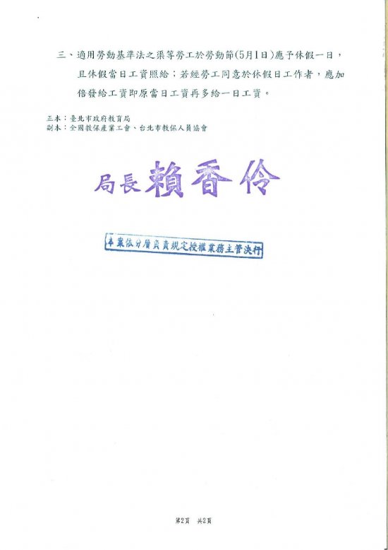 **各級學校應使適用勞動基準法之勞工(含教保員)勞動節休假一日**