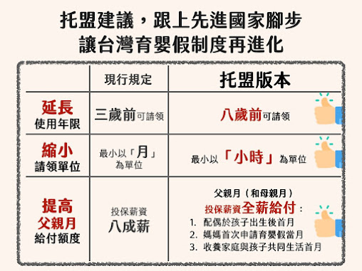 國際上育嬰假制度修法的趨勢為,2019年歐盟會議通過工作與生活平衡的指令(The Work-life Balance Directive)要求會員國利用三年時間遵守該指令的立法措施,其中一項即是「讓家長有更靈活的彈性工作安排,以利照顧八歲之前的幼童」。瑞典不但已經達成,更走在最前端,將育嬰假的使用年限延長至子女滿十二歲前(先前是到子女滿八歲)。對此,托盟提出修正「性別工作平等法」第十六條、「就業保險法」第十一條,將家長請領育嬰假的時間,由現行的子女滿三歲前,修改為子女滿八歲前,完整涵蓋幼兒所需照顧的年齡。